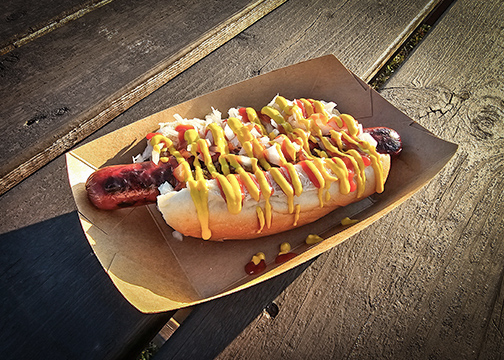 ΒΌ pound beef dawg, topped with your choice of ketchup, mustard, relish, onions, & sauerkraut (shown loaded)