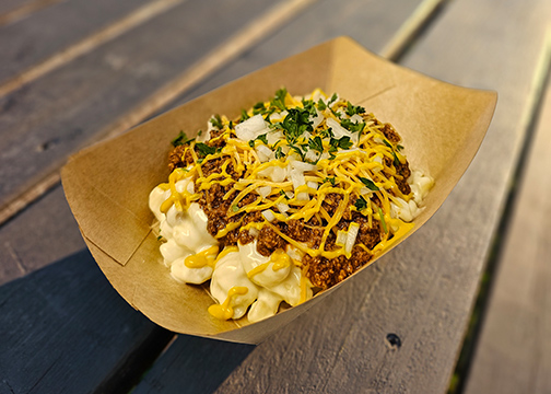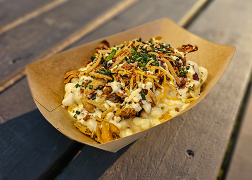 Our mac n' cheese topped with chipotle chili made with Earth Rider's North Tower Stout, shredded cheese, onions, & mustard